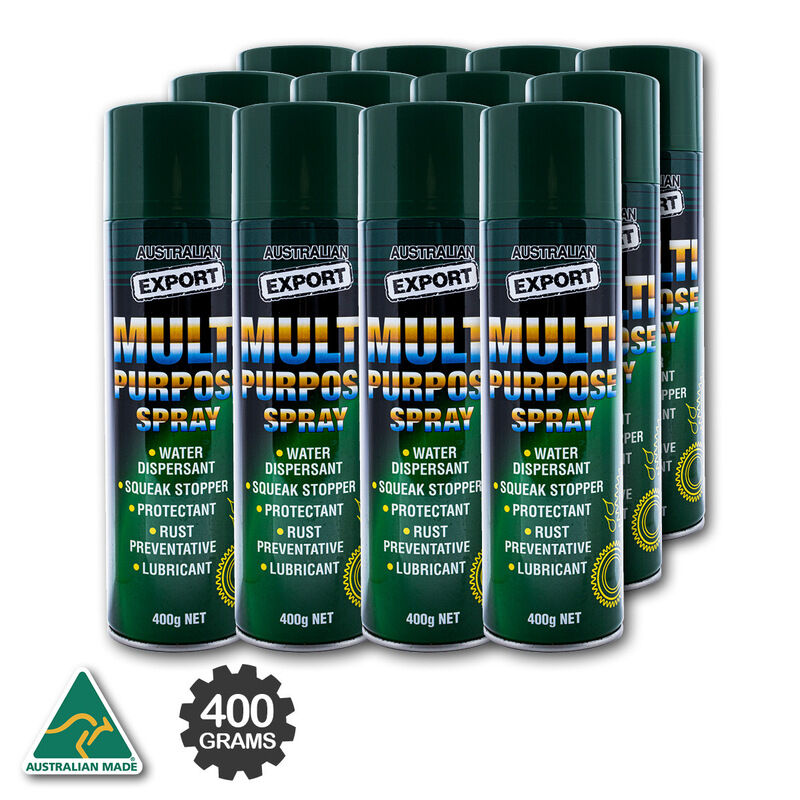 AUSTRALIAN EXPORT multi-purpose (Water Dispersant) Spray that is formulated to lubricate and protect. Containing Propellant Hydrocarbon and Aluminium Pressurised????this product is suitable for use on wet engine motors, rusty iron, squeaky hinges, motor parts and any home imperfections. Proudly Australian Made and an effective lubricant, squeak stopper and rust preventative????this product can be applied to multiple surfaces????that is available in our handy 12 pack.