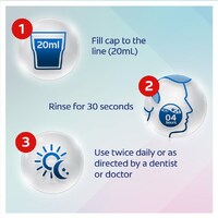 - Keep out of reach of children. Fill cap to the line (20mL). Rinse mouth thoroughly for 30 seconds, gargle and expel. Do not swallow. Do not dilute. Do not use if cap seal is broken. Not recommended for children under 7 years.