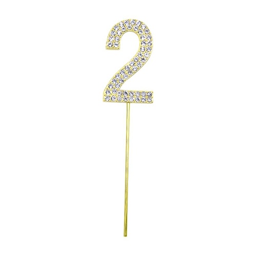 This dazzling cake topper has a gold number 2 made of metal, encrusted with diamantes on one side attached to a gold metal stick. Simply push the stick into the cake for a shimmering birthday decoration!