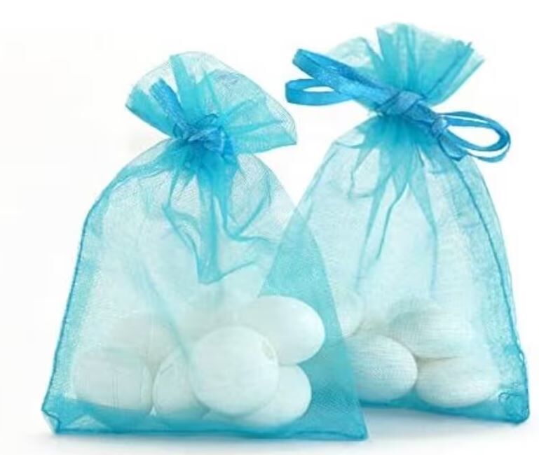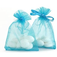 Light blue organza bags measuring 9cm x 12cm (approximately 3.5" x 4.75") in packs of 20 pieces are widely available from various online retailers. These sheer bags, typically with a drawstring closure, are commonly used for packaging small gifts, wedding and party favors, or storing jewelry and candies.