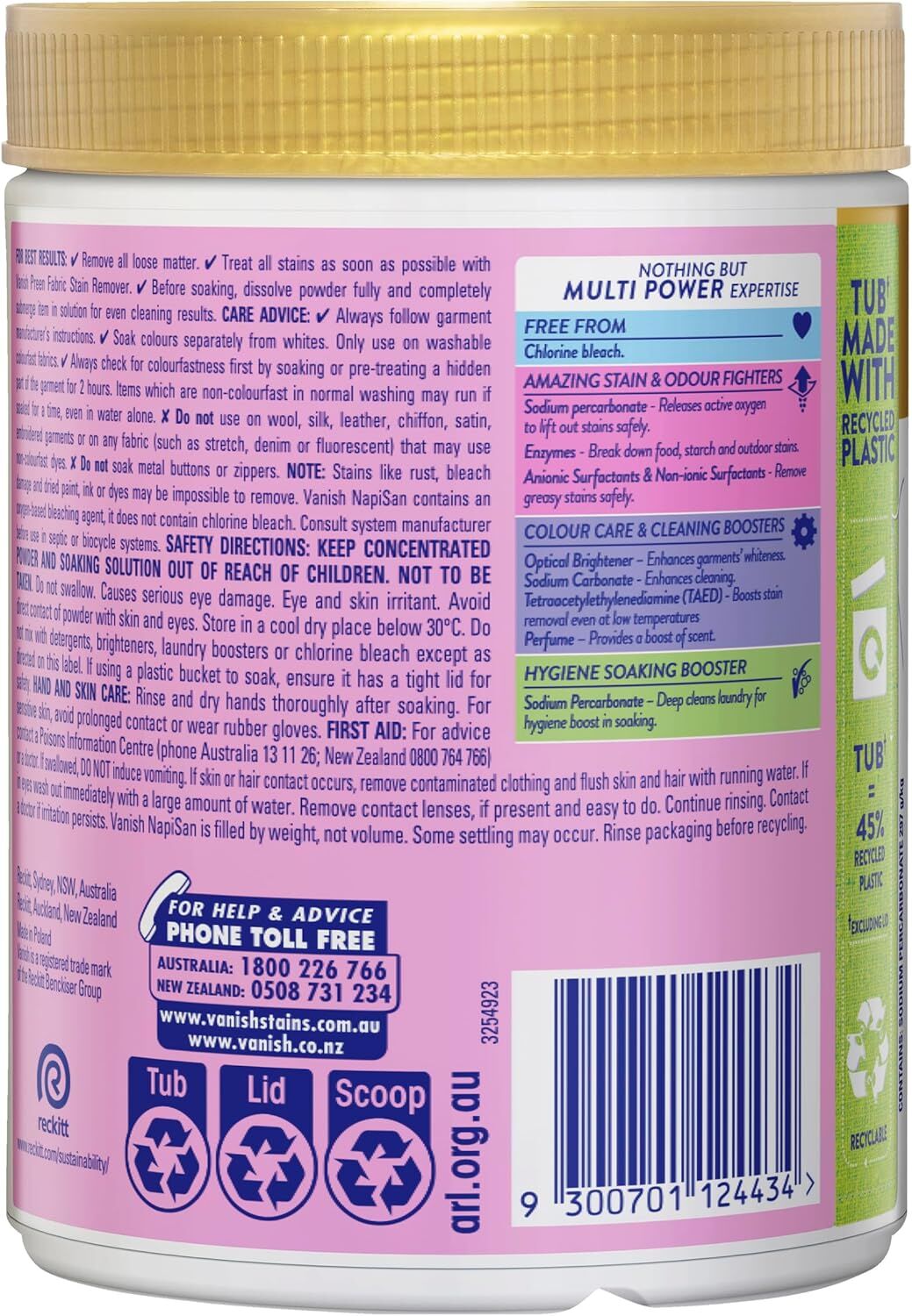 Vanish Napisan Gold Pro White Stain Remover is our best stain removal in cold 30 mins. Revitalises whites. Colours & white stain remover and chlorine bleach free. Australia & NZ's #1 Stain remover brand (Best-selling Stain Remover Brand (Pre-wash segment combined) in Australia & New Zealand Grocery (Nielsen MAT 07/11/2023)).