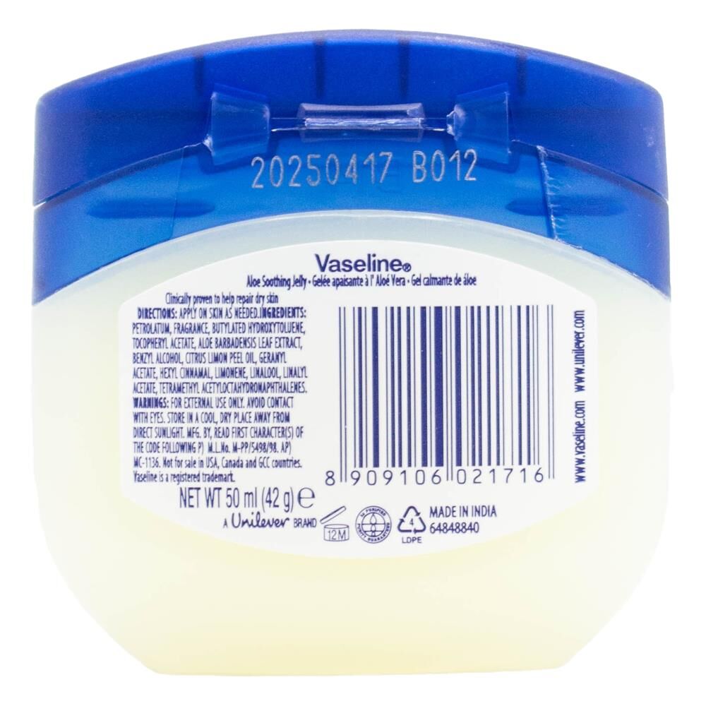 The product is Vaseline 50mL Soothing Jelly Aloe After Sun Moisturiser, a small, travel-sized tube designed to soothe and hydrate skin after sun exposure. It contains aloe vera and Vaseline Jelly to cool, calm, and replenish moisture in sun-exposed or irritated skin. The formula is fast-absorbing, non-greasy, and can also be used on minor cuts, burns, and other dry areas.